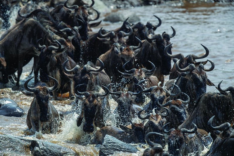 Pendant les mois d’été, ce spectacle atteint son apogée dans le nord de la Tanzanie. D’immenses files d’animaux se forment en direction du Serengeti et de la région de Grumeti, qu’ils atteignent généralement en juin et juillet. En août, ils arrivent à la frontière du Kenya, où se déroule l’un des moments les plus dramatiques et captivants de la migration : le passage de la rivière Mara. Les animaux s’entassent sur les rives, hésitant avant de se jeter à l’eau dans une course désespérée pour atteindre l’autre côté, au risque d’être attrapés par les crocodiles affamés.
